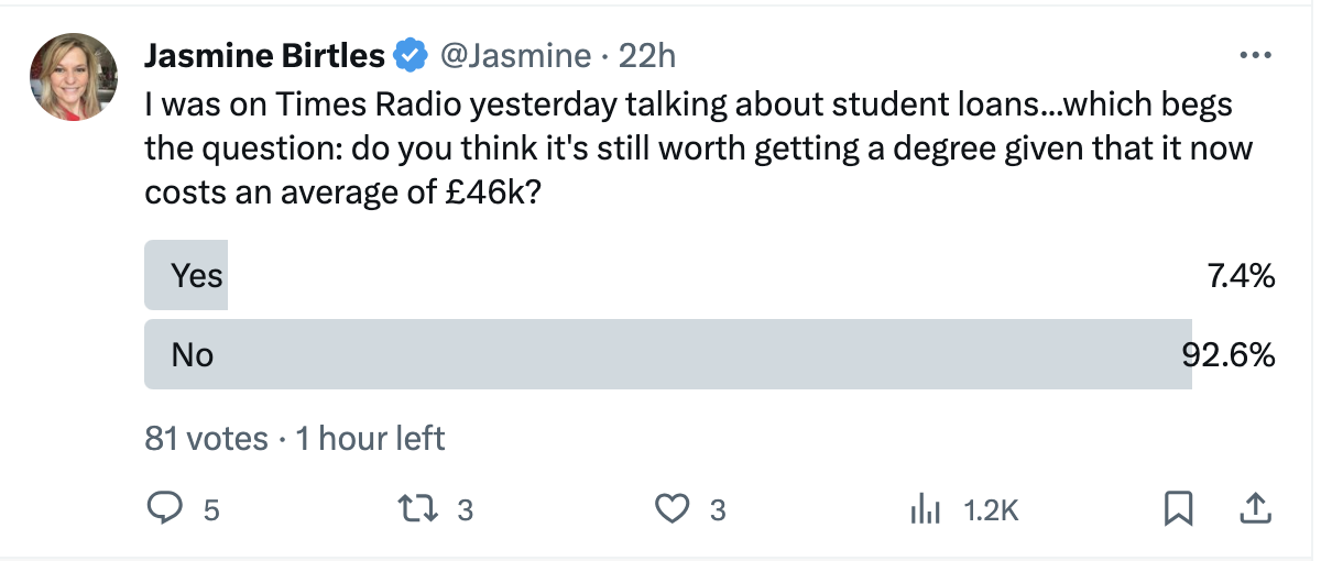 I gave my Twitter followers a ‘yes/no’ option to the question: “is it still worth getting a degree given that it now costs an average of £46k?”