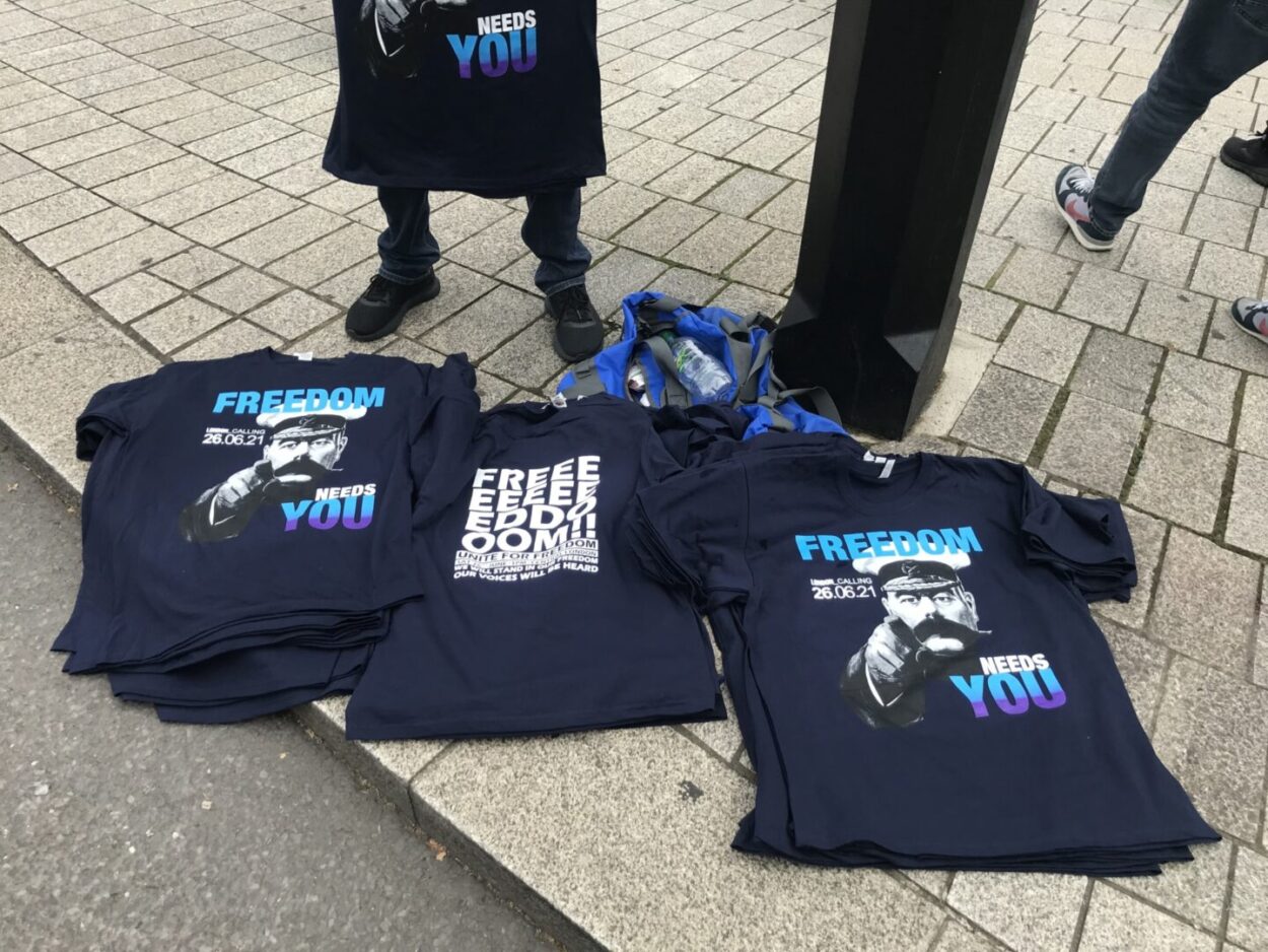 At the Freedom March on June 26th, the man mentioned above stood by Trafalgar square with his T-shirts on the ground selling them quite briskly.