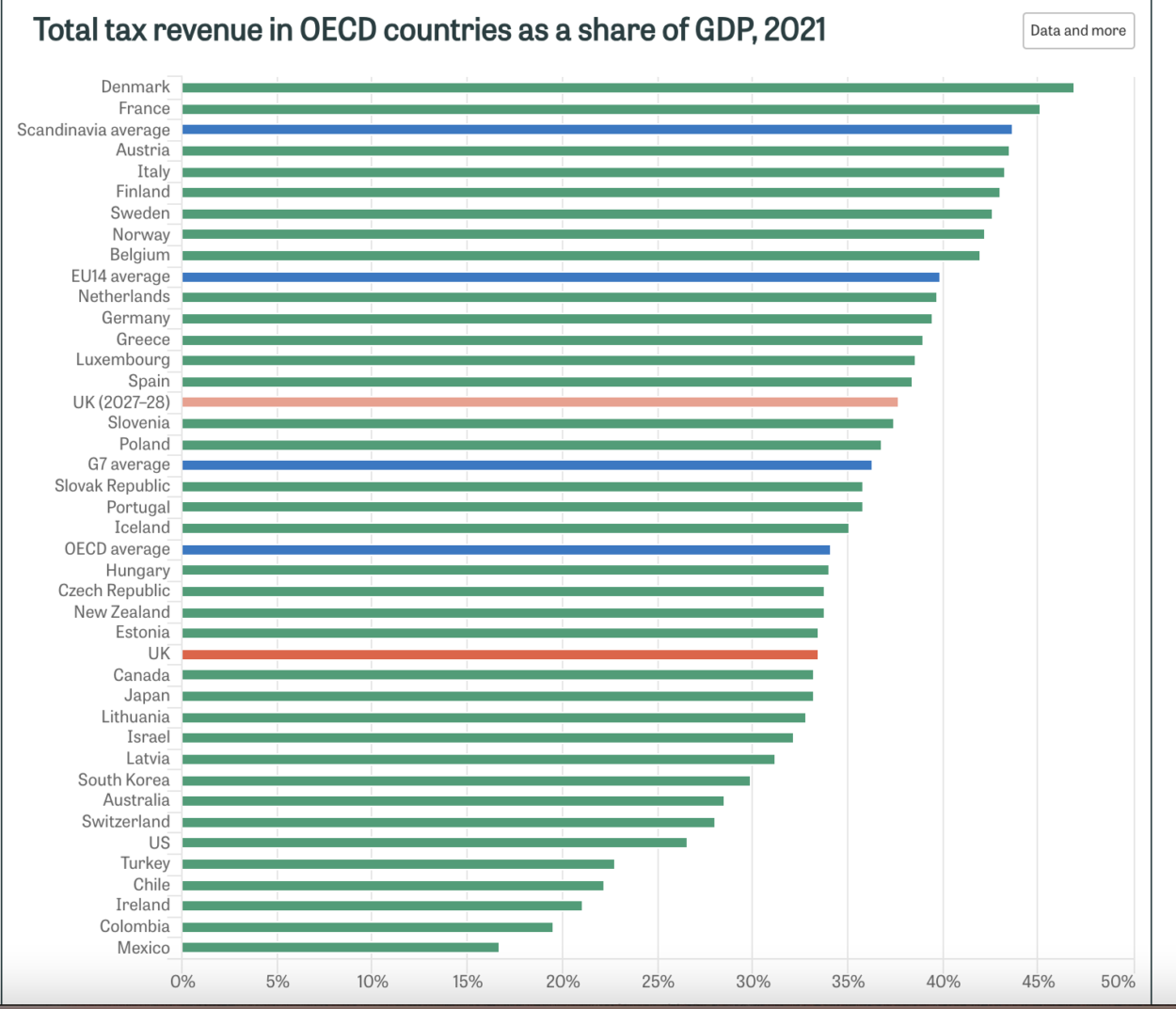So I looked it up and it turns out that even with the latest ridiculous tax rises (from the so-called party of low taxation, the Conservatives) we actually pay less tax than the average for developed countries – even lower than most Eastern European countries